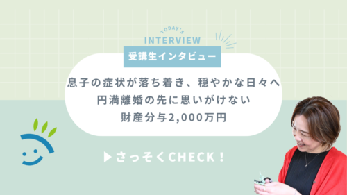 公開準備中: 息子の症状が落ち着き、穏やかな日々へ。円満離婚の先に思いがけない財産分与2,000万円【受講生インタビュー】