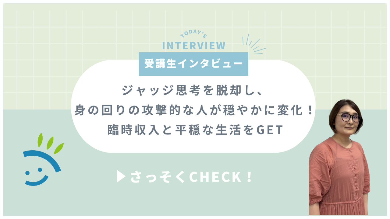 彩さんは、お金や仕事・職場に関して悩みを抱えていました。そんな中思考の学校オンラインで学んだ結果、ご自身の心にゆとりや安心感が生まれたり、互いを思いやれる仲間に出会えたりなど、変化が起きます。さらに臨時収入もGET!