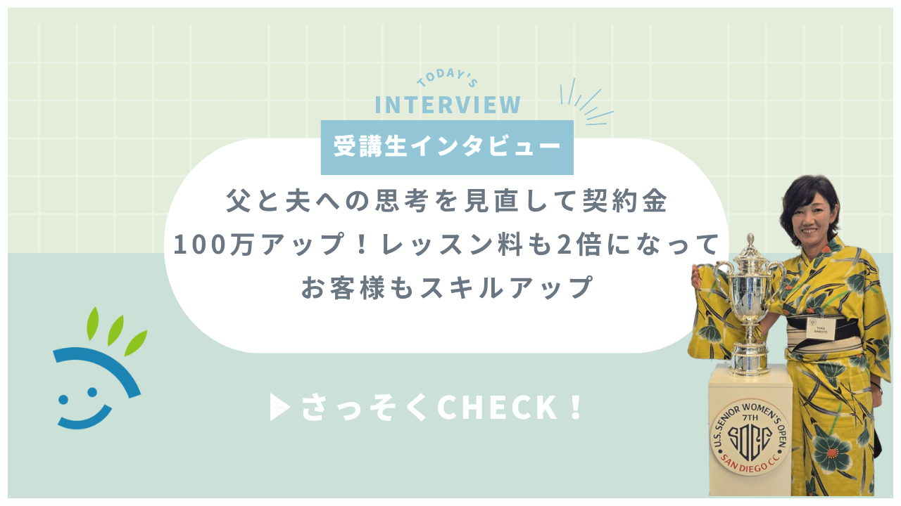 ゆかさんのストーリー、いかがでしたか?ご主人やお父様を見直して、契約金が100万アップ!レッスン料も2倍になって、お客様にも喜んでいただけて、着実に学びの成果が出ていますよね。後日、ご主人のインタビューもアップするのでお楽しみに!