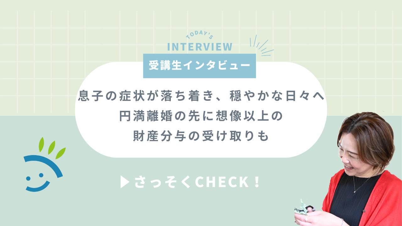 思考を見直したことで、息子さんの状態が落ち着き、さらに夫婦関係にも区切りをつけるという大きな決断をされました。離婚後には想像以上の財産分与を受け取り、金銭面だけでなく気持ちの面でも大きな安心につながったそうです。