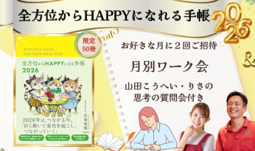 2025.10.31【限定50冊】全方位からHAPPYになれる手帳2026 月別ワーク会&山田こうへい・りさの思考質問会付き 2025.10.312025.09.28 勉強会・イベント 上級認定講師・山田りさ