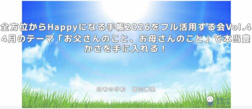 4月26日(日)21時〜 zoom開催|全方位からHappyになる手帳2026をフル活用する会Vol.4 4月のテーマ「お父さんのこと、お母さんのこと」で本当豊かさを手に入れる! 2026.04.262026.03.17 勉強会・イベント 上級認定講師・愛加進哉